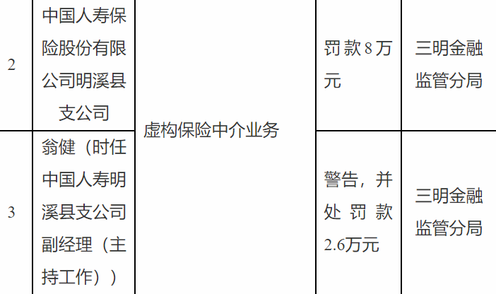 8月12日,三明金融监管分局行政处罚信息公示表显示国家正规炒股平台,中国人寿保险股份有限公司明溪县支公司因虚构保险中介业务被罚款8万元,责任人翁某被警告,并处罚款2.6万元。